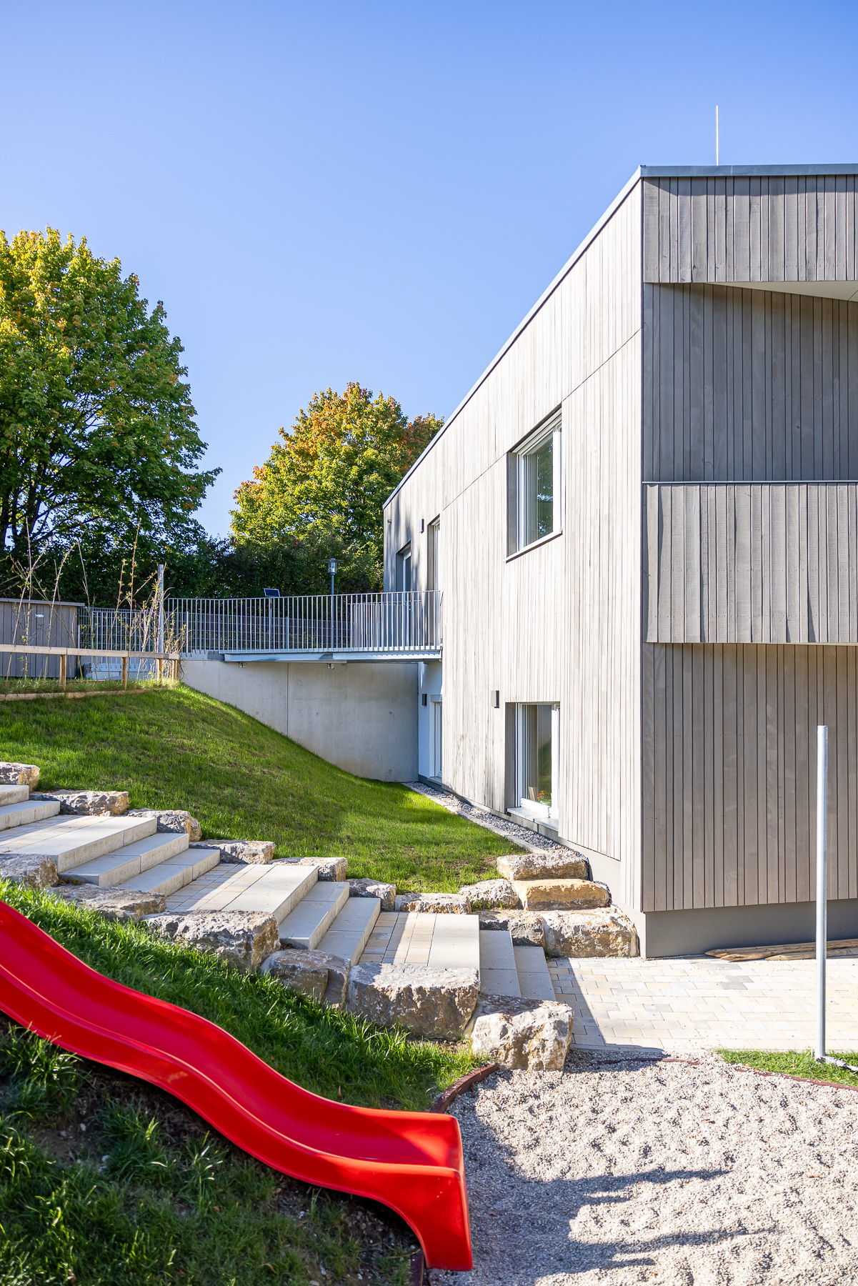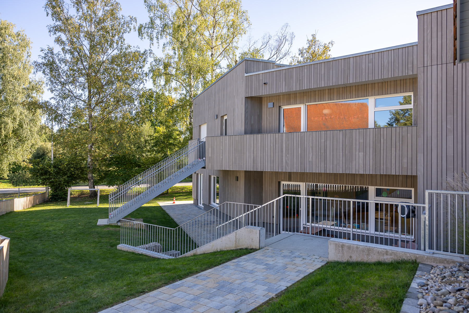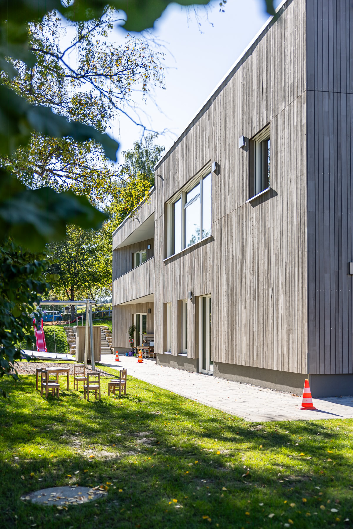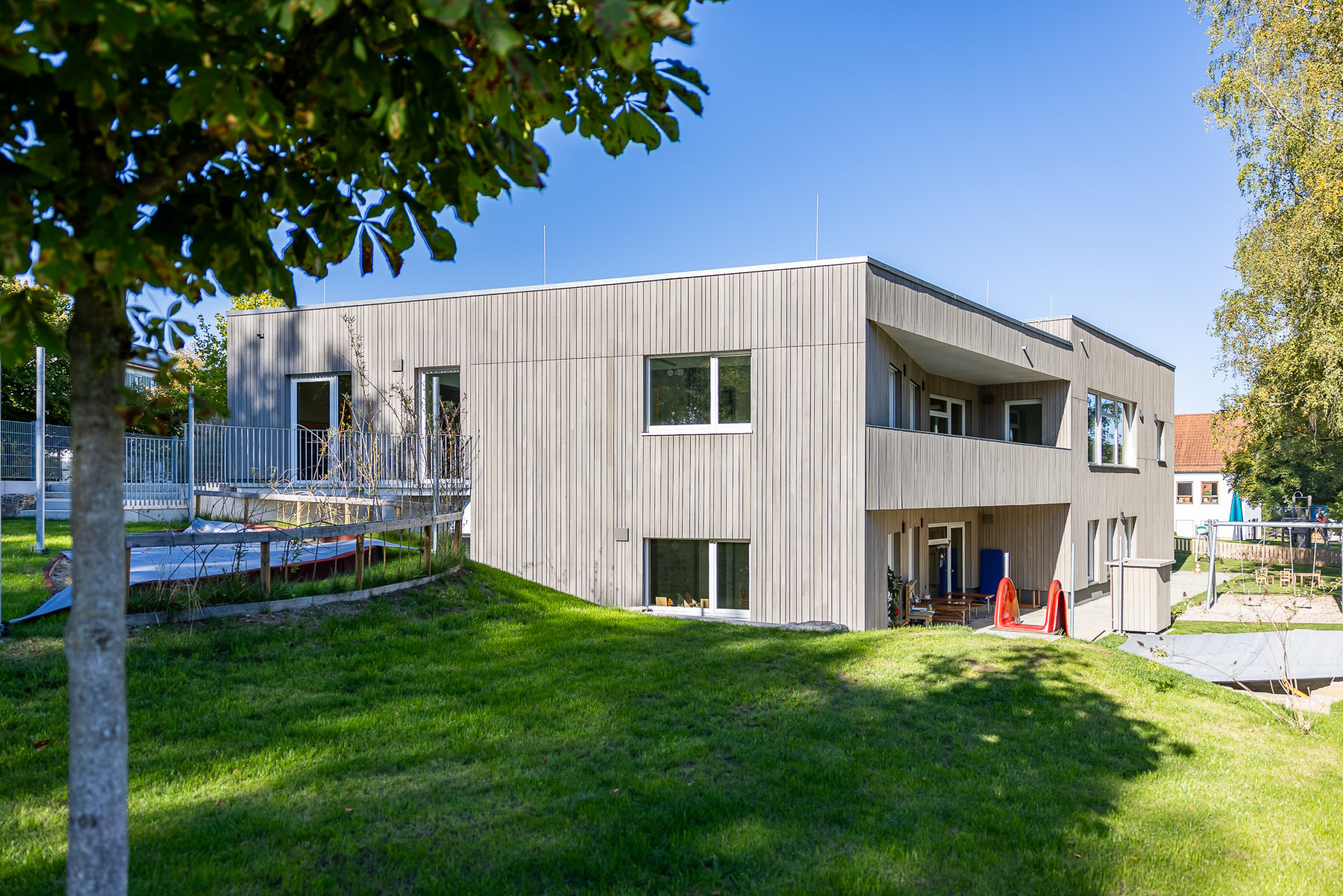 Das neue Gebäude als Kita bietet genügend Raum und Infrastruktur für eine zeitgemäße Kinderbetreuung — mit Gruppenräumen, Krippenbereich und ausreichend Außen- sowie Bewegungsflächen. Mit dem Neubau wird das Angebot der Gemeinde auf eine moderne, zukunftsorientierte Kita-Einrichtung erweitert und langfristig gesichert.